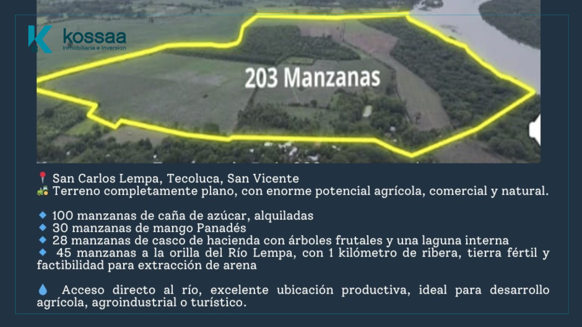 Terreno ubicado en zona productiva con 100 manzanas de caña de azúcar alquiladas, 30 manzanas de mango Panadés, 28 manzanas con casco de hacienda, árboles frutales y laguna interna. Incluye 45 manzanas a la orilla del Río Lempa con aproximadamente 1 km de ribera, tierra fértil y posibilidad de extracción de arena. Ideal para proyectos agrícolas, agroindustriales o turísticos gracias a su topografía plana y acceso al río.