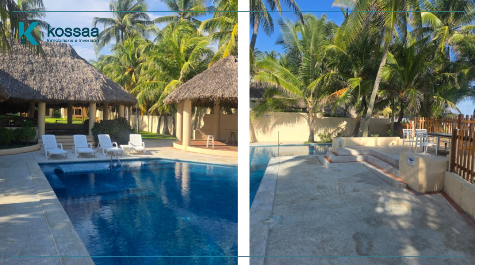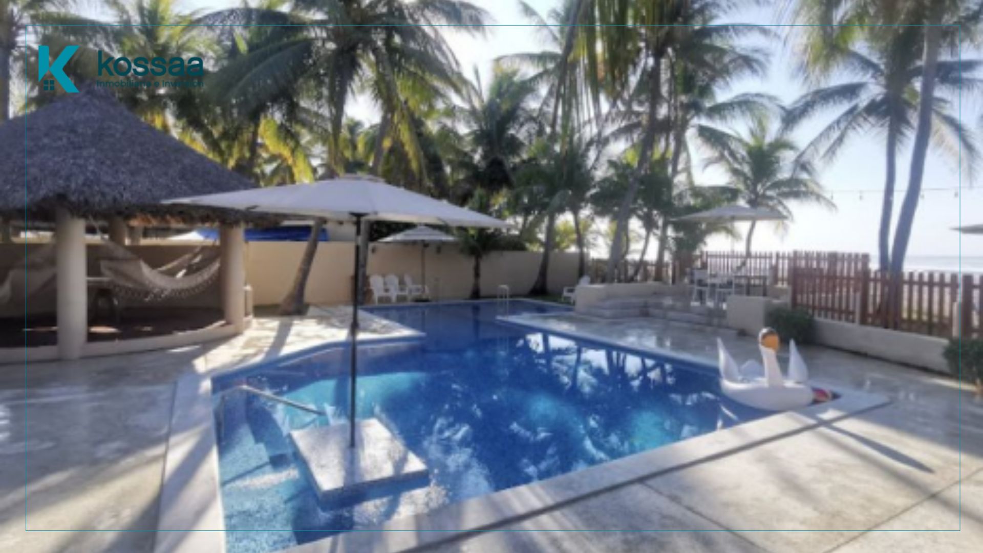 La propiedad está rodeada de palmeras y áreas verdes, con espacios diseñados para disfrutar del entorno de playa, piscina y zonas de convivencia.